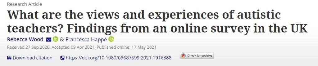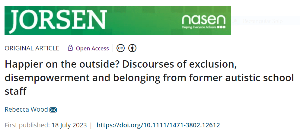 In this journal article, the experiences and views of 12 former autistic school staff are explored. There is a particular focus on the language they used in interviews, and this revealed multiple manifestations of marginalisation and exclusion experienced by participants before they stopped working in schools. A key trope was invisibility: some participants were made to feel invisible, but at the same time, might try to be invisible (e.g., through masking) in order to be able to cope with their time in schools. This included being able to be open about being autistic, which participants did not always feel was safe, although not all of them knew that they were autistic at the time. Importantly, the participants also reported a number of positives, including being able to empathise with, and understand how best to support, children who were at risk of marginalisation themselves. Some participants also expressed a preference for a non-hierarchical approach, ‘being on a level’ with children, rather than being a disciplinarian. Having an intense focus and a passion for their work (monotropism) was also felt to be advantageous for schools. Most participants were content with their current circumstances, and many had retained a link with education in their professional life, but crucially, were now able to work on their own terms. One of the key take-home messages from participants is that autistic-led training is vital to tackle the issues they experienced, for both autistic and non-autistic teachers in schools.
